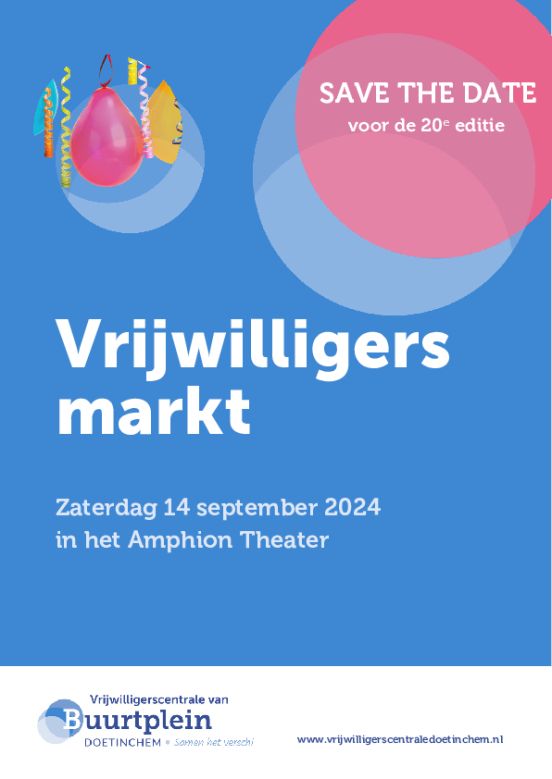 Save the date voor de Vrijwilligersmarkt Wanneer je vrijwilligerswerk zoekt en/of wanneer jouw vrijwilligersorganisatie vrijwilligers zoekt, noteer dan alvast zaterdag 14 september 2024 in jouw agenda.