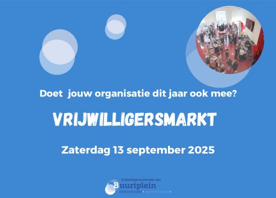 - Heb jij jouw organisatie aangemeld voor de Vrijwilligersmarkt én nog geen actieve vacatures uitgezet via onze vrijwilligersvacaturebank? Ons advies is, doe dit alsnog vóór de Vrijwilligersmarkt, zodat een geïnteresseerde aspirant-vrijwilliger voorafgaand aan de markt of naderhand jouw vacature(s) kan bekijken via onze vacaturebank.